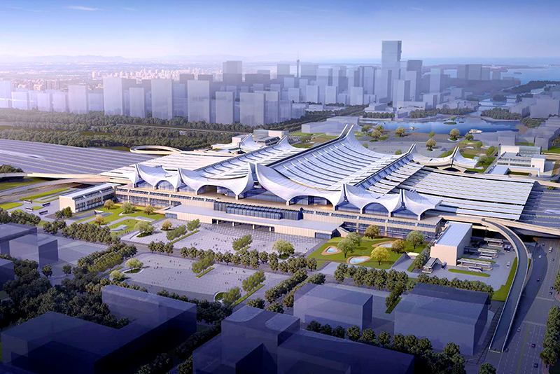 青島紅島站站房設(shè)計(jì)為“一大兩小、中間大兩邊小”的浪花造型,主體為鋼筋混凝土混合框架結(jié)構(gòu),屋面結(jié)構(gòu)為雙向鋼桁架結(jié)構(gòu),落客平臺單向預(yù)應(yīng)力鋼筋混凝土梁板結(jié)構(gòu),站臺雨棚為無站臺柱大跨鋼框架結(jié)構(gòu)。 總用鋼量將達(dá)4.2萬噸,最大鋼結(jié)構(gòu)跨度長約62米,通過分段拼裝完成。