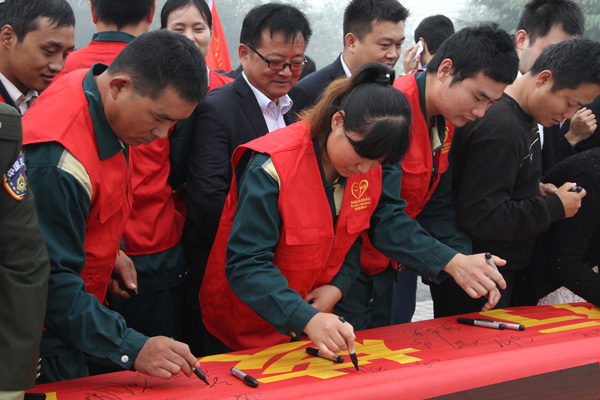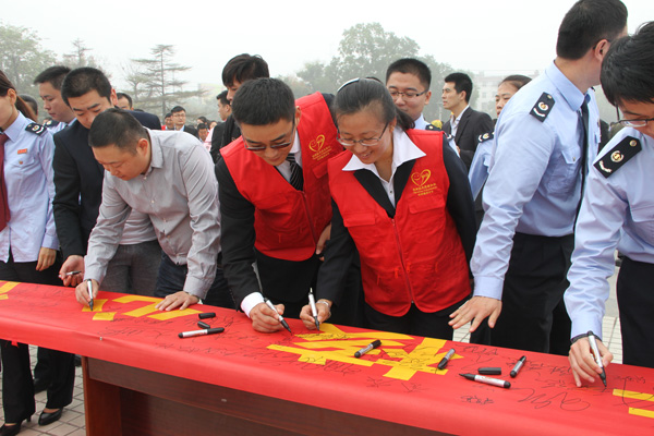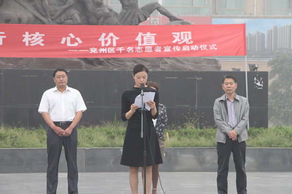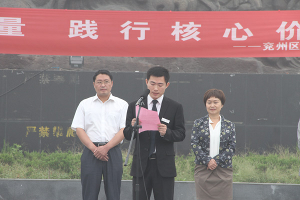 儀式由王仁娜副區(qū)長(zhǎng)主持。區(qū)委宣傳部副部長(zhǎng)邢衛(wèi)紅宣讀了《兗州區(qū)弘揚(yáng)社會(huì)正能量踐行核心價(jià)值觀倡議書》。集團(tuán)公司志愿者卞中凱作為全區(qū)企業(yè)屆代表作了表態(tài)發(fā)言。儀式上頒發(fā)了活動(dòng)宣傳書籍和資料。初建偉部長(zhǎng)作了重要講話。活動(dòng)最后,廣大志愿者們?cè)诨顒?dòng)條幅上鄭重簽下了自己的名字。