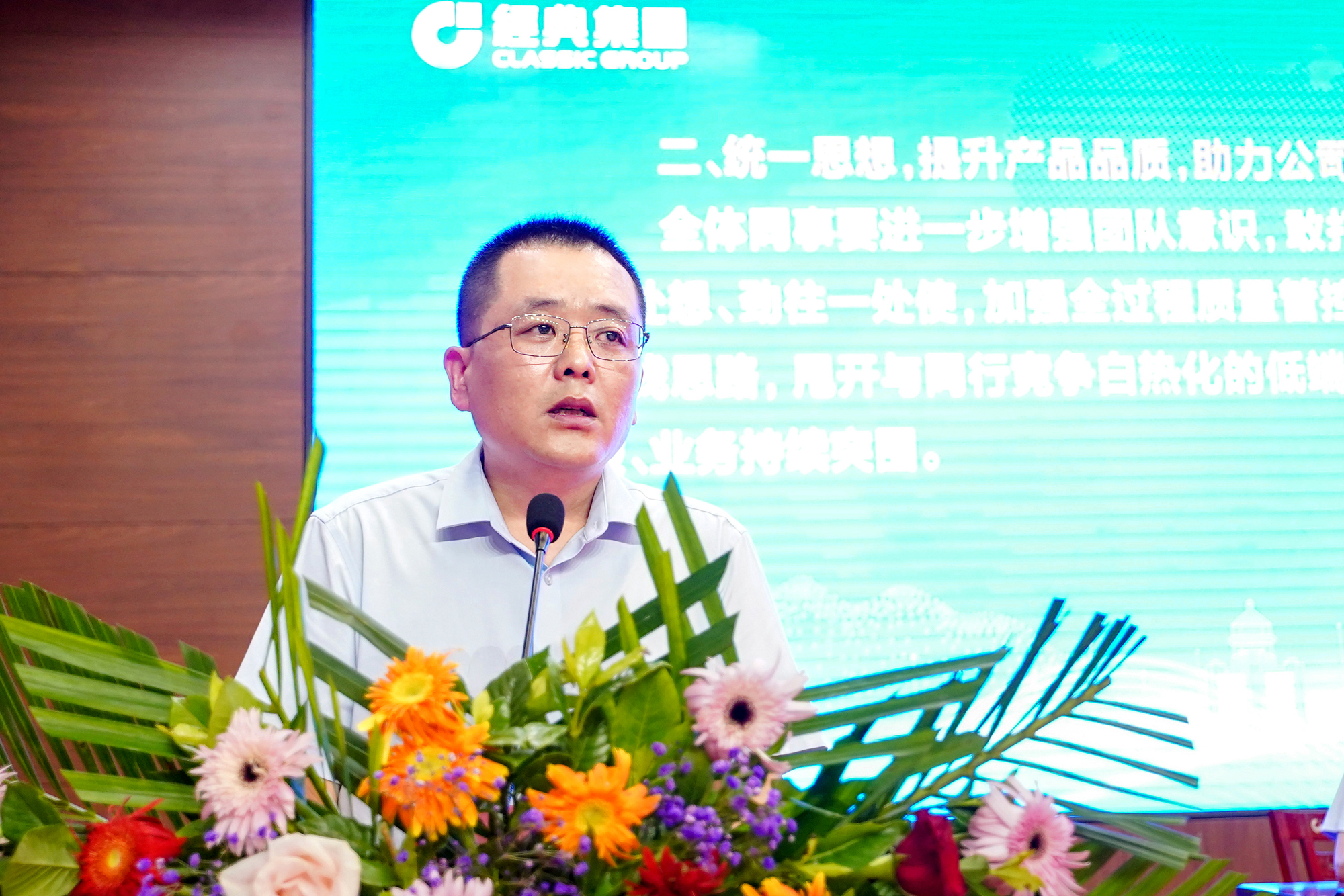 集團董事長史振華作重要講話,經典控股總經理高建國宣讀了表彰決定,集團副總經理兼生產總監張琦總結上半年工作完成情況,對下半年工作做了統籌安排,集團副總經理侯士輝主持大會。